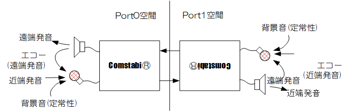 | 6 | Port0空間が拡声通話、Port1側がハイブリッド回路と接続するときに、Port0空間で発生するエコーと背景音、ハイブリッドエコーにそれぞれのComstabi® が対応します。 | ![]() |